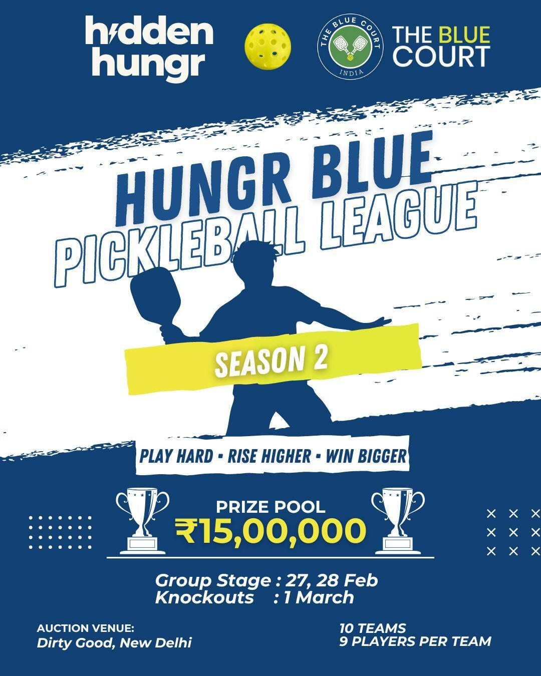 Welcome to the HUNGR BLUE PICKLE LEAGUEThis is your chance to compete in a high-intensity, high-visibility format featuring a prize pool of ₹15 Lakh+.